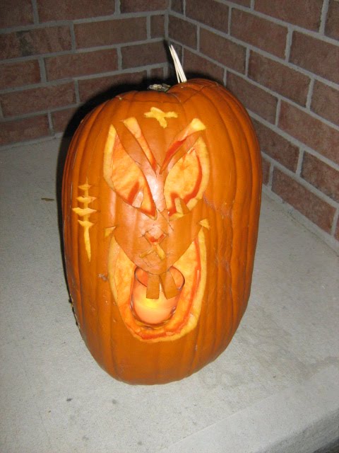 Hi there! I know it's been days since Halloween (and given the Christmas decorations popping up in malls and stores, it'd be more appropriate for me to share Christmas pictures!), but I just have to show you the jack-o-lantern that the boy carved ALL BY HIMSELF this year. The boy has skills (and not just of the "my generation uses the internet for everything" kind, lol)*.You can really tell that the demographics of our neighbourhood are changing ... some years, we had 200+ trick or treaters at our door; this year, the doorbell rang maybe 15 times, for a total of about 40 kids.